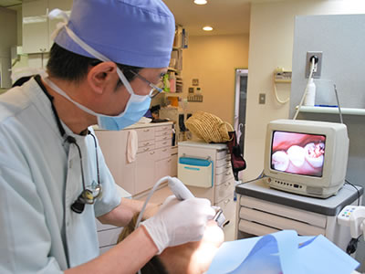 現在の口腔内の状態、放置しておくとどうなるのか、どのような治療法がありそれぞれの利点・欠点は何か、治療後どのような状態になるのか等を、CCDカメラやスライドによるビジュアルを利用し、より詳細に、丁寧に、わかりやすく説明します。
